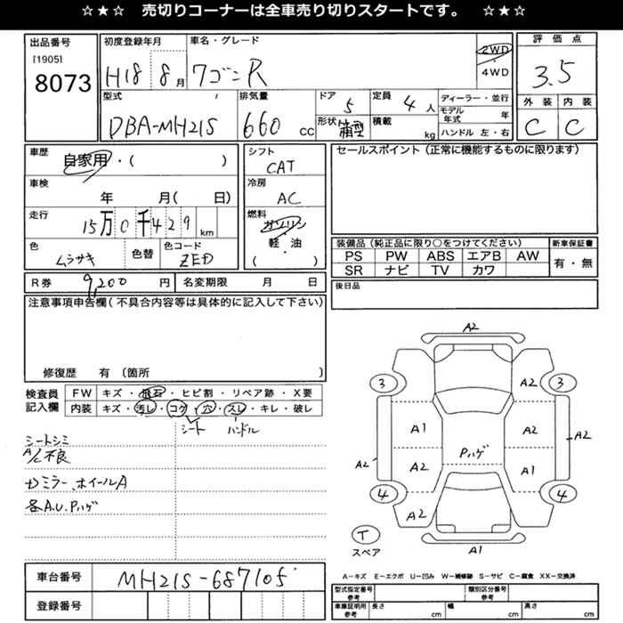 | NAVI SPECIAL TURBO | CBA-MH21S | K6A | FF | 4AT | 658cc | 60ps(44kW)/6000rpm | AИ-92 | 1 422 750 | |