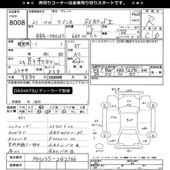 | FX LIMITED II | DBA-MH23S | K6A | FF | 4AT | 658cc | 54ps(40kW)/6500rpm | AИ-92 | 1 155 000 |