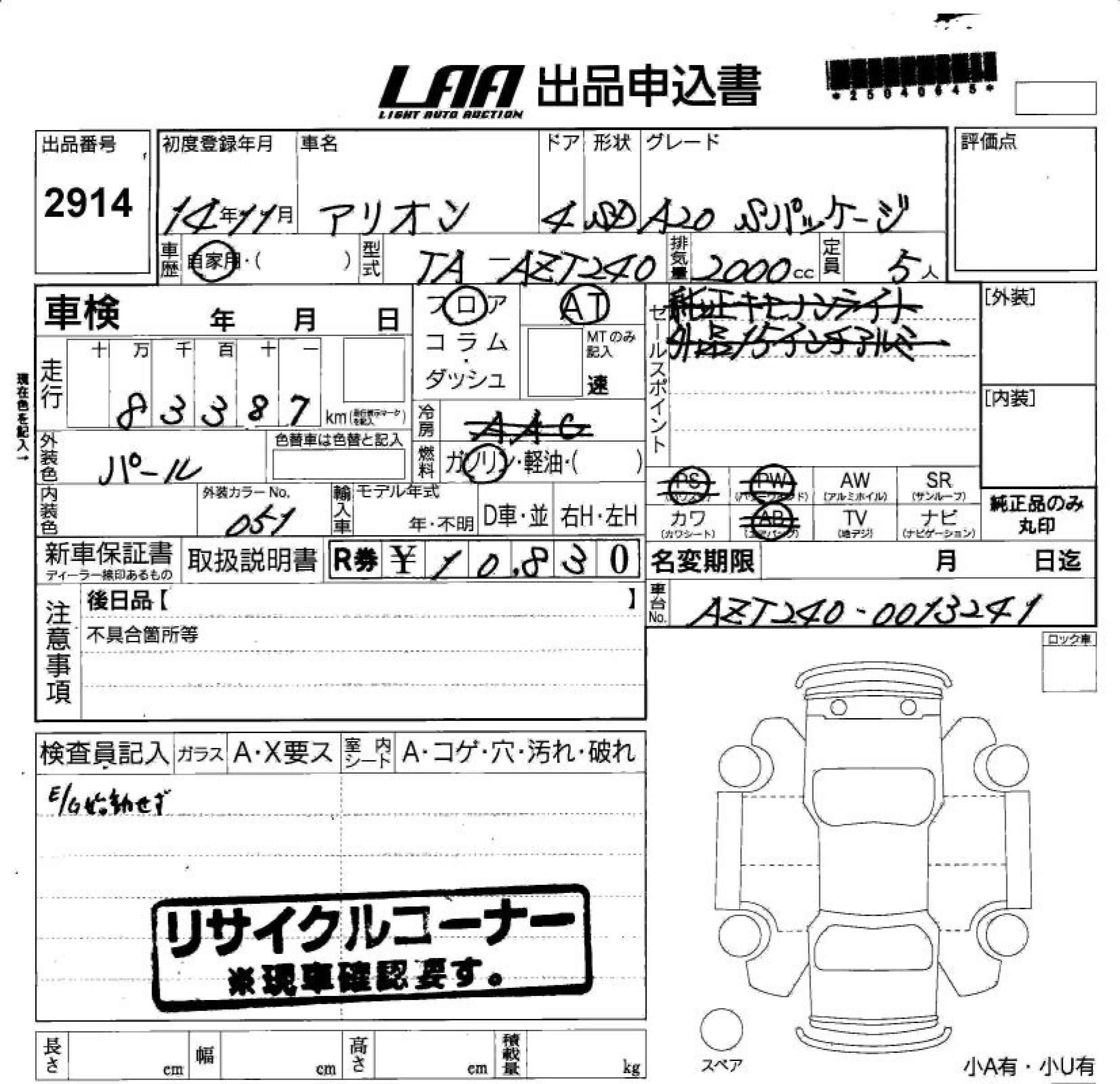 | A15 G PACKAGE | UA-NZT240 | 1NZ-FE | FF | 4AT | 1496cc | 109ps(80kW)/6000rpm | AИ-92 | 1 645 000 |