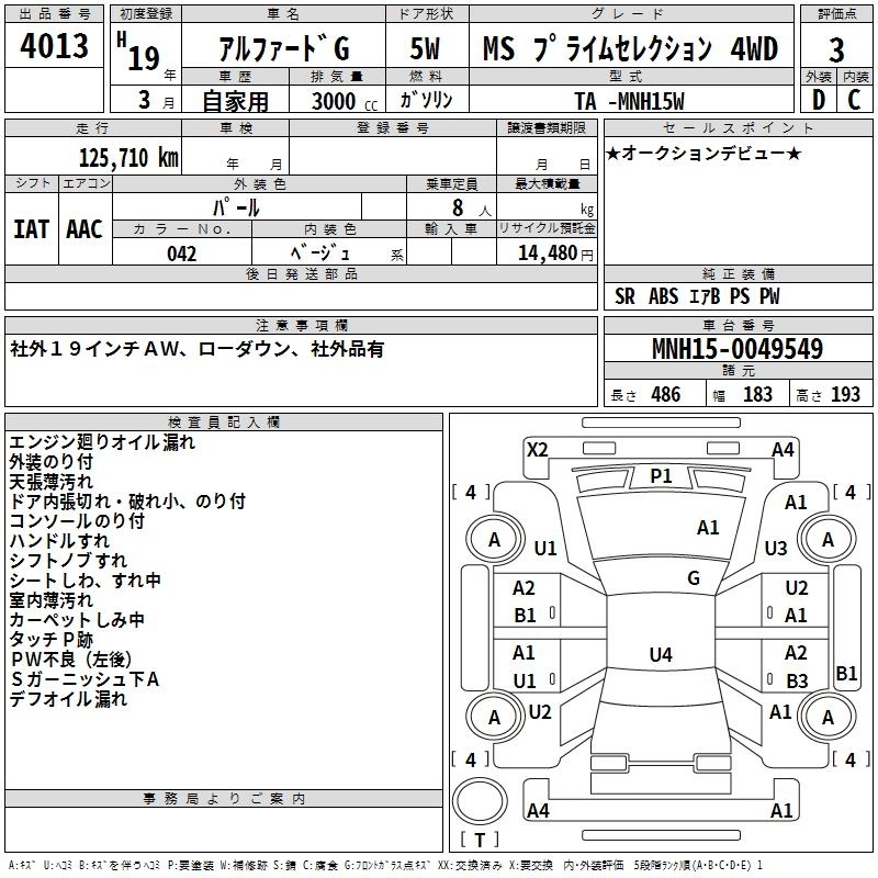 | AS PRIME SELECTIONII | DBA-ANH15W | 2AZ-FE | Full-time 4WD | 4AT | 2362cc | 159ps(117kW)/5600rpm | AИ-92 | 3 612 000 | |