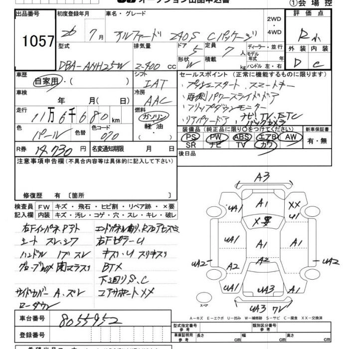 | 240S C PACKAGE | DBA-ANH25W | 2AZ-FE | Full-time 4WD | CVT | 2362cc | 170ps(125kW)/6000rpm | AИ-92 | 4 185 257 | |