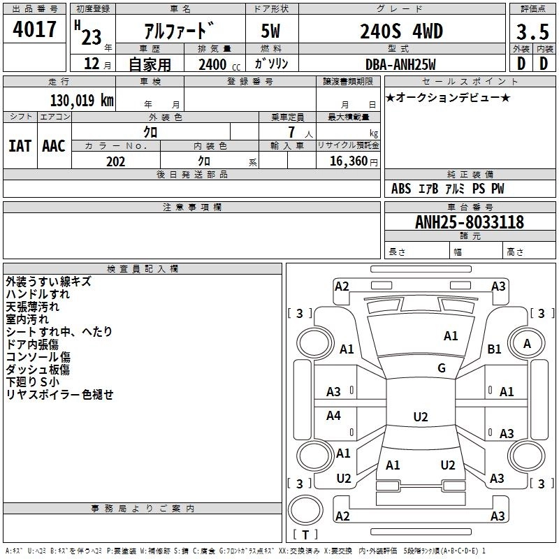 | 240S PRIME SELECTION II TYPE GOLD II | DBA-ANH25W | 2AZ-FE | Full-time 4WD | CVT | 2362cc | 170ps(125kW)/6000rpm | AИ-92 | 3 770 000 | |