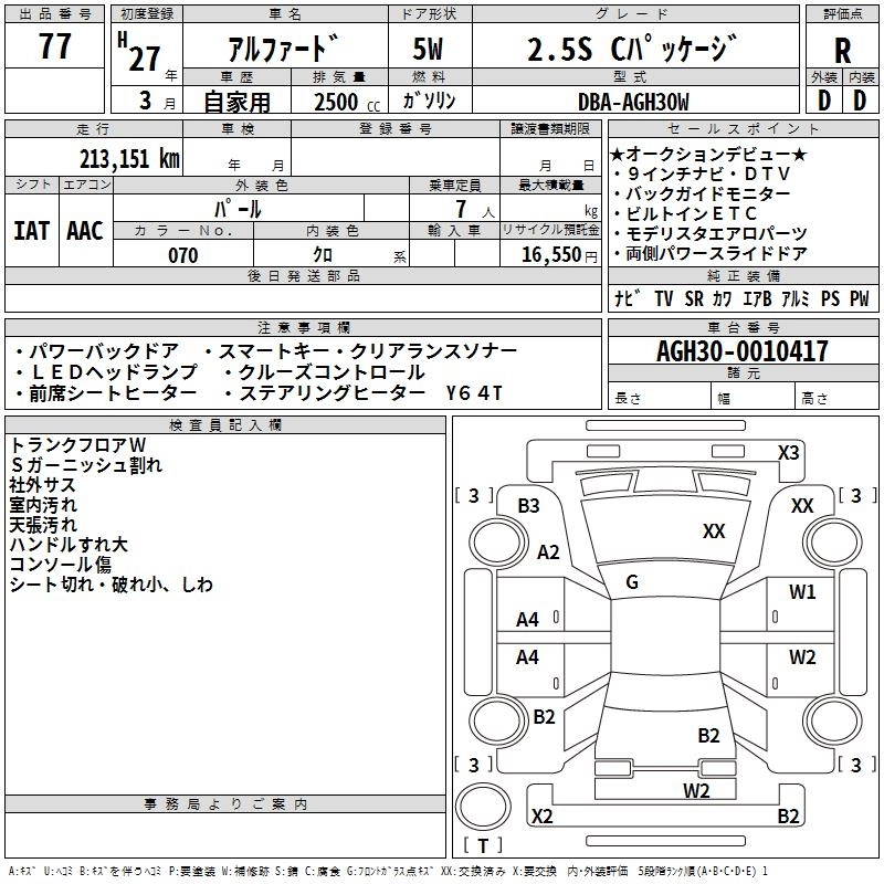 | 2.5G | DBA-AGH35W | 2AR-FE | Full-time 4WD | CVT | 2493cc | 182ps(134kW)/6000rpm | AИ-92 | 4 204 145 | |