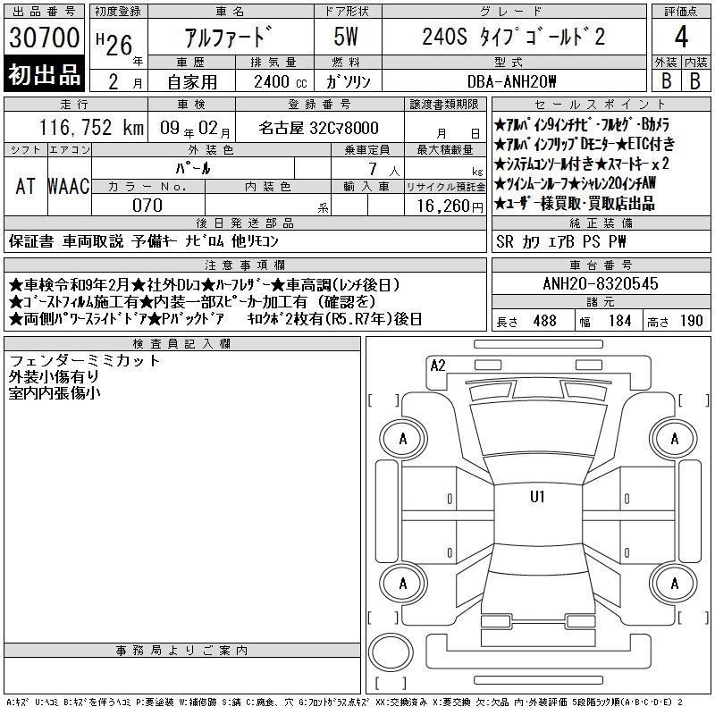 | 240S C PACKAGE | DBA-ANH25W | 2AZ-FE | Full-time 4WD | CVT | 2362cc | 170ps(125kW)/6000rpm | AИ-92 | 4 185 257 | |