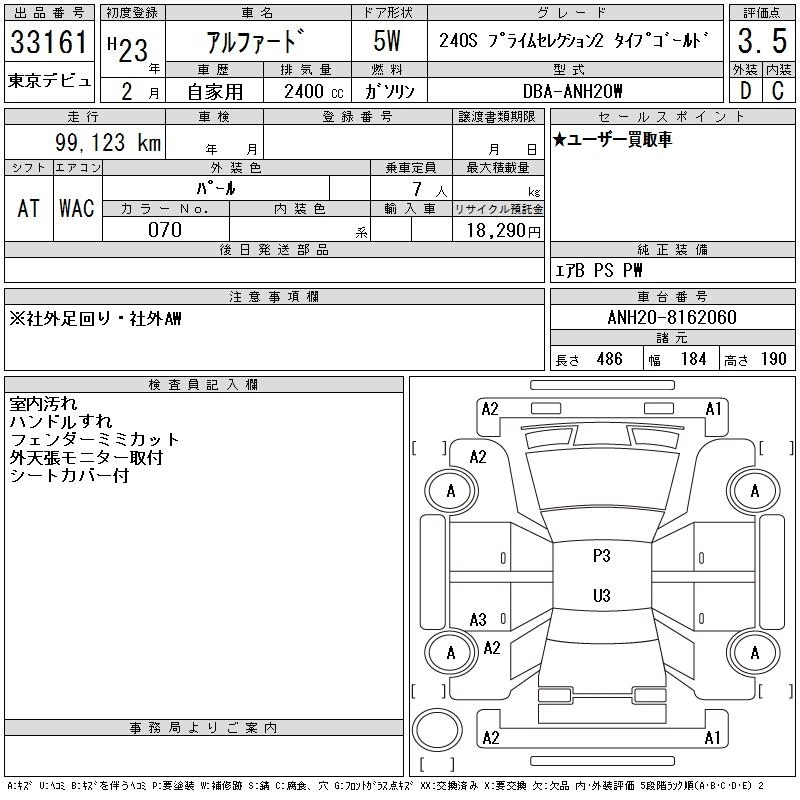 | 240S PRIME SELECTION II TYPE GOLD II | DBA-ANH25W | 2AZ-FE | Full-time 4WD | CVT | 2362cc | 170ps(125kW)/6000rpm | AИ-92 | 3 770 000 | |
