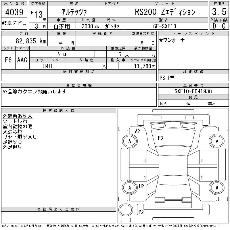 | RS200 Z EDITION | GH-SXE10 | 3S-GE | FR | 5AT | 1998cc | 200ps(147kW)/7000rpm | AИ-95 | 2 560 000 | |