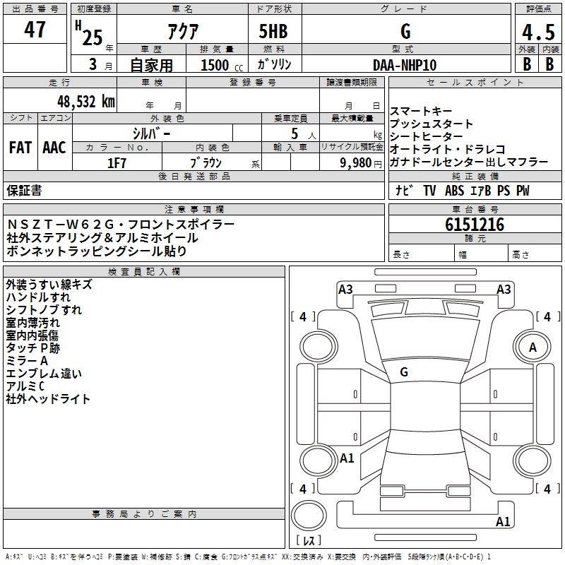 | S | DAA-NHP10 | 1NZ-FXE | FF | CVT | 1496cc | 74ps(54kW)/4800rpm | AИ-92 | 1 800 000 | |