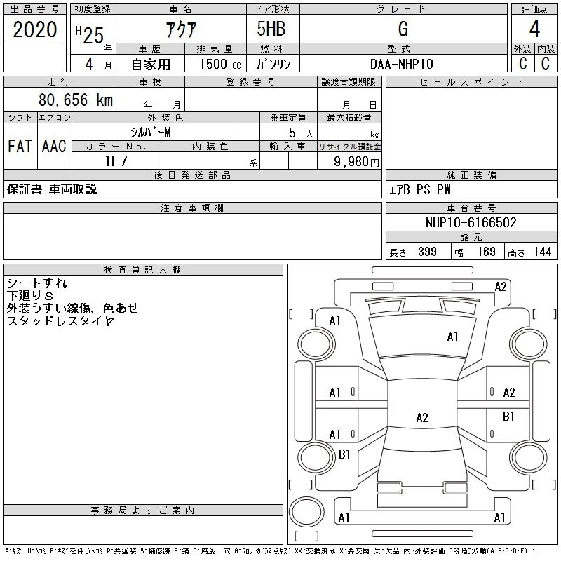 | G | DAA-NHP10 | 1NZ-FXE | FF | CVT | 1496cc | 74ps(54kW)/4800rpm | AИ-92 | 1 860 000 | |