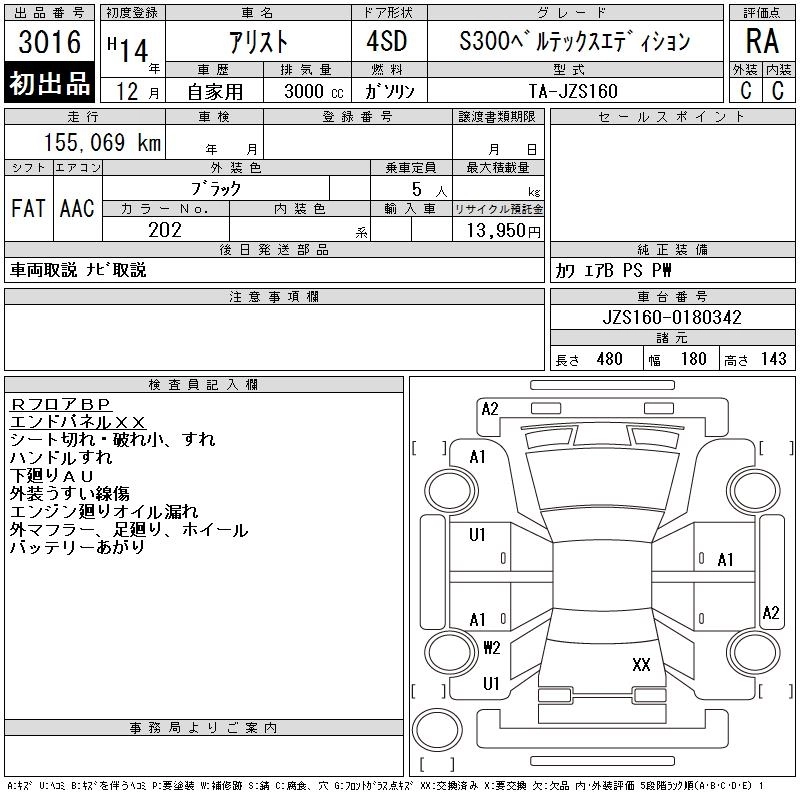 | S300 VERTEX EDITION | TA-JZS160 | 2JZ-GE | FR | 5AT | 2997cc | 230ps(169kW)/6000rpm | AИ-95 | 3 870 000 | |