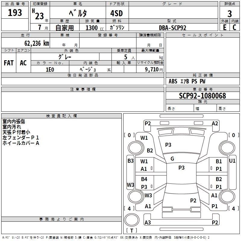 | X | DBA-SCP92 | 2SZ-FE | FF | CVT | 1296cc | 87ps(64kW)/6000rpm | AИ-92 | 1 415 000 | |