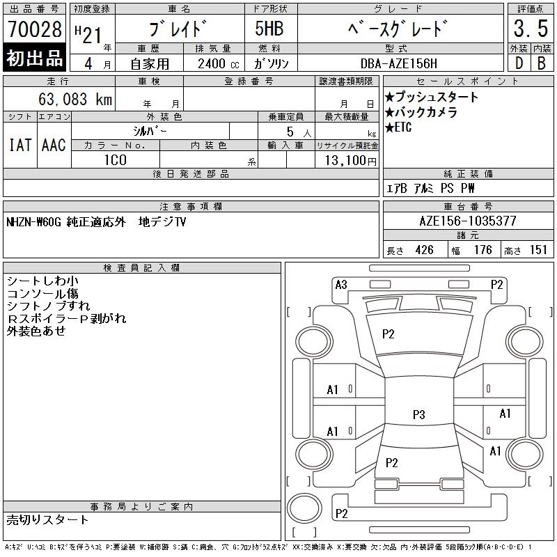 | BASE GRADE | DBA-AZE156H | 2AZ-FE | FF | CVT | 2362cc | 167ps(123kW)/6000rpm | AИ-92 | 2 300 000 |