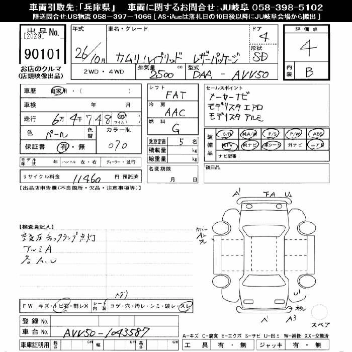 | HYBRID LEATHER PACKAGE | DAA-AVV50 | 2AR-FXE | FF | CVT | 2493cc | 160ps(118kW)/5700rpm | AИ-92 | 3 939 429 | |