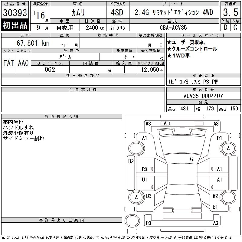 | 2.4G LIMITED EDITION | CBA-ACV35 | 2AZ-FE | Full-time 4WD | 4AT | 2362cc | 159ps(117kW)/5600rpm | AИ-92 | 2 866 500 | |