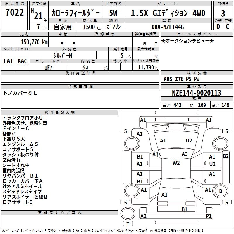 | X 202 | DBA-NZE144G | 1NZ-FE | Full-time 4WD | CVT | 1496cc | 105ps(77kW)/6000rpm | AИ-92 | 2 179 000 | |