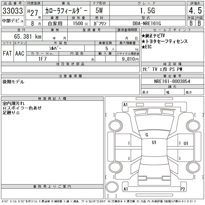| 1.5G AEROTOURER | DBA-NRE161G | 2NR-FKE | FF | CVT | 1496cc | 109ps(80kW)/6000rpm | AИ-92 | 1 989 163 | |