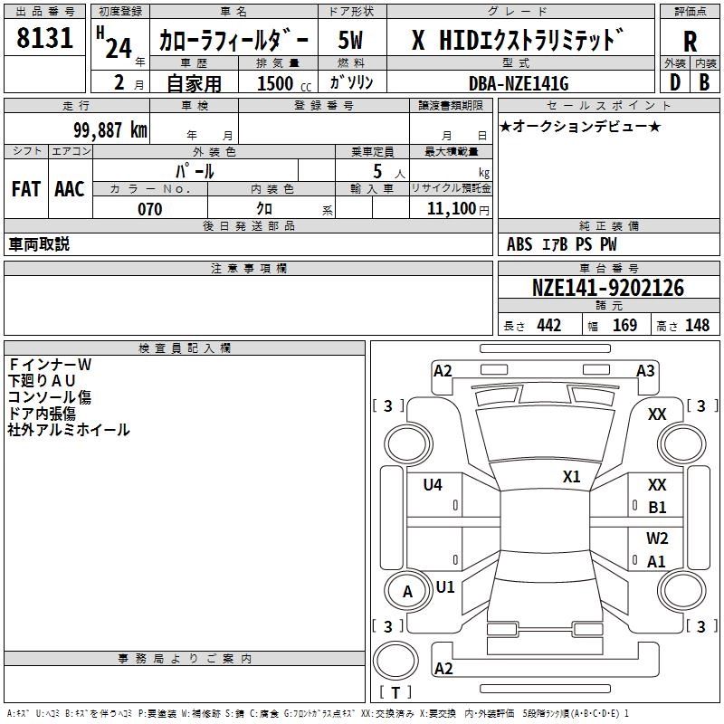 | 1.5G AEROTOURER W。゚B | DBA-NZE161G | 1NZ-FE | FF | CVT | 1496cc | 109ps(80kW)/6000rpm | AИ-92 | 1 930 000 |