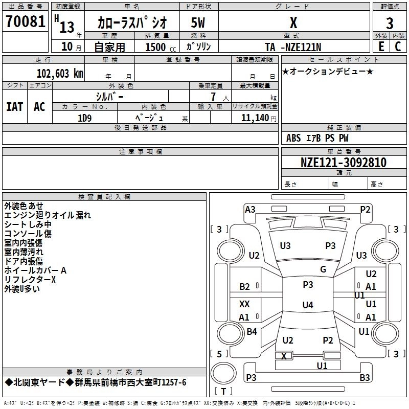 | X | TA-NZE121N | 1NZ-FE | FF | 4AT | 1496cc | 110ps(81kW)/6000rpm | AИ-92 | 1 537 000 | |