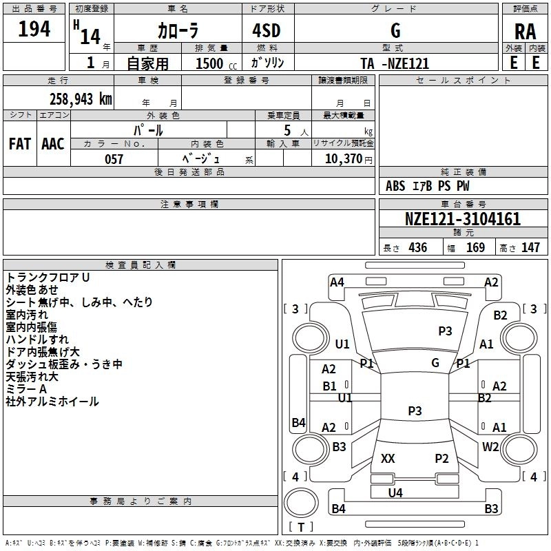 | G | UA-NZE121 | 1NZ-FE | FF | 4AT | 1496cc | 109ps(80kW)/6000rpm | AИ-92 | 1 528 000 | |