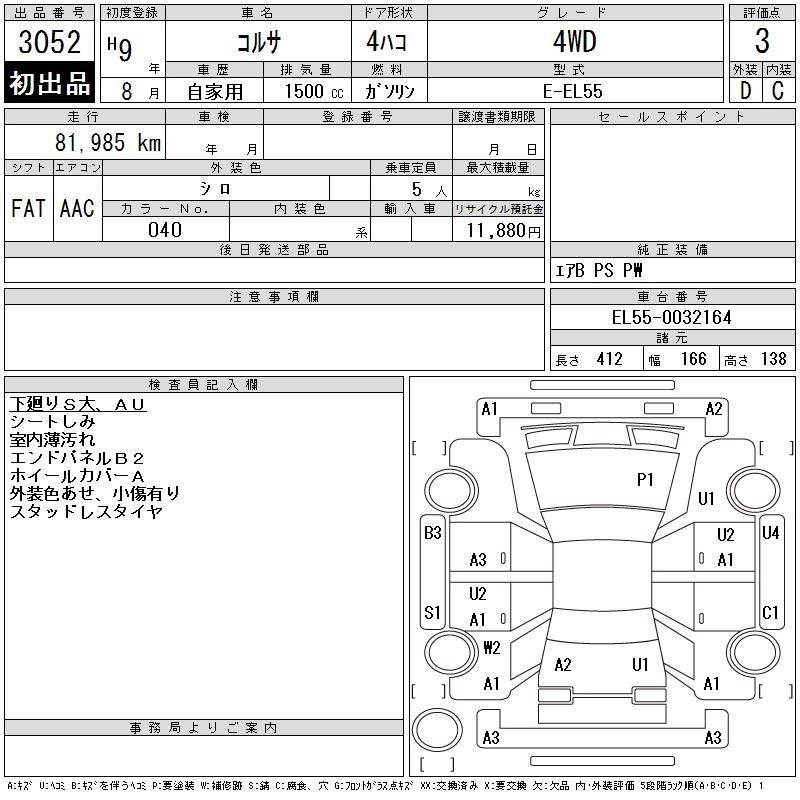 | AX LIMITED | E-EL51 | 4E-FE | FF | 4MT | 1331cc | 85ps(63kW)/5500rpm | AИ-92 | 1 107 000 | |