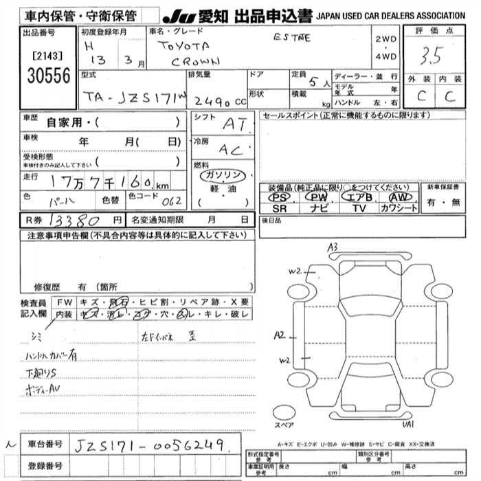 | ATHLETE | TA-JZS171W | 1JZ-FSE | FR | 5AT | 2491cc | 200ps(147kW)/6000rpm | AИ-95 | 3 500 000 | |