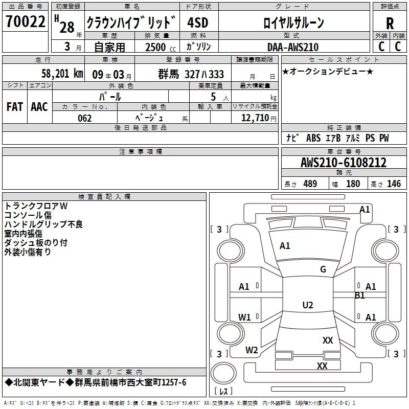 | ROYAL SALOON | DAA-AWS210 | 2AR-FSE | FR | CVT | 2493cc | 178ps(131kW)/6000rpm | AИ-92 | 5 022 000 | |