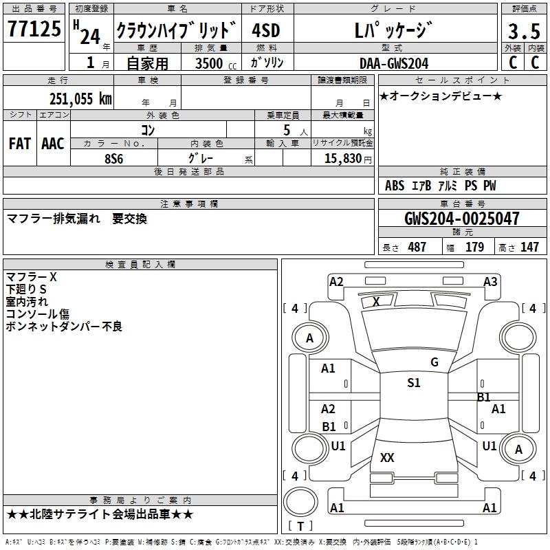 TOYOTA CROWN HYBRID 2012 г., лот № 77125