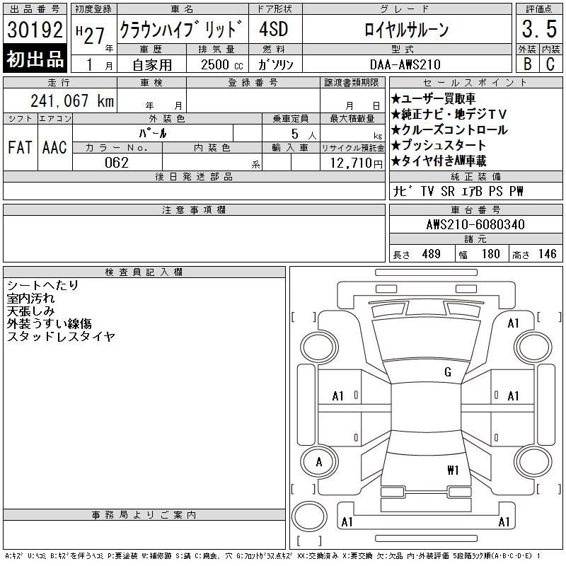 | ROYAL | DAA-AWS210 | 2AR-FSE | FR | CVT | 2493cc | 178ps(131kW)/6000rpm | AИ-92 | 4 310 000 | |