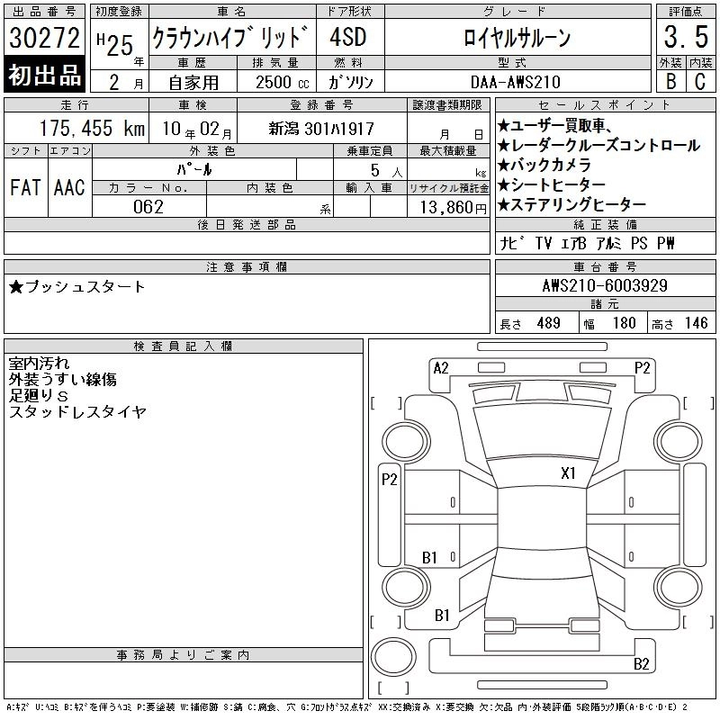 | ROYAL | DAA-AWS210 | 2AR-FSE | FR | CVT | 2493cc | 178ps(131kW)/6000rpm | AИ-92 | 4 100 000 | |