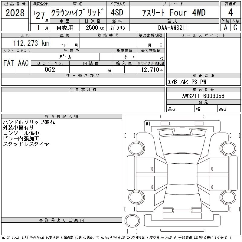 | ROYAL SALOON FOUR | DAA-AWS211 | 2AR-FSE | Full-time 4WD | CVT | 2493cc | 178ps(131kW)/6000rpm | AИ-92 | 5 156 000 | |