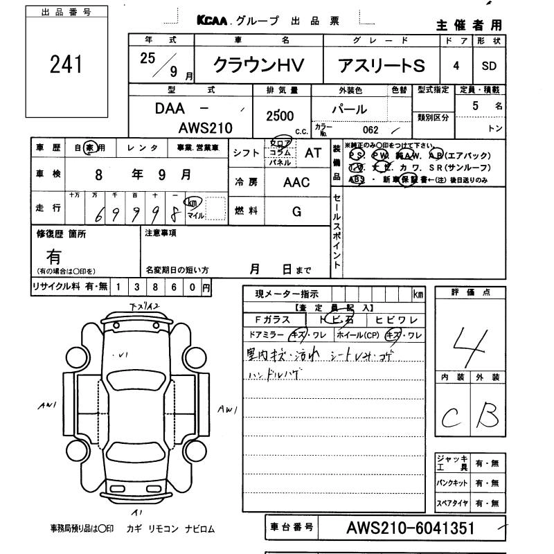 | ROYAL | DAA-AWS210 | 2AR-FSE | FR | CVT | 2493cc | 178ps(131kW)/6000rpm | AИ-92 | 4 100 000 | |