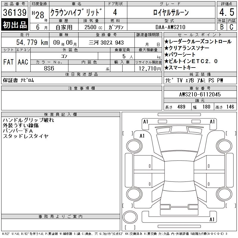 | ROYAL | DAA-AWS210 | 2AR-FSE | FR | CVT | 2493cc | 178ps(131kW)/6000rpm | AИ-92 | 4 395 600 | |