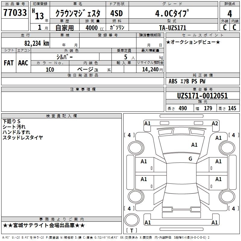 | 4.0C TYPE | TA-UZS171 | 1UZ-FE | FR | 5AT | 3968cc | 280ps(206kW)/6000rpm | AИ-95 | 5 130 000 | |