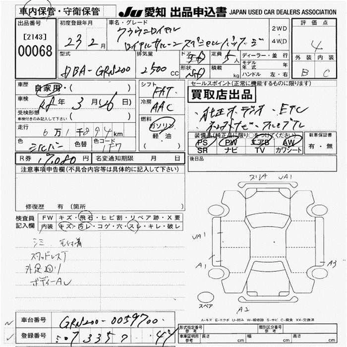 | 3.0 ROYAL SALOON I-FOUR ANNIVERSARY EDITION | DBA-GRS203 | 3GR-FSE | Full-time 4WD | 6AT | 2994cc | 256ps(188kW)/6200rpm | AИ-95 | 5 030 000 | |