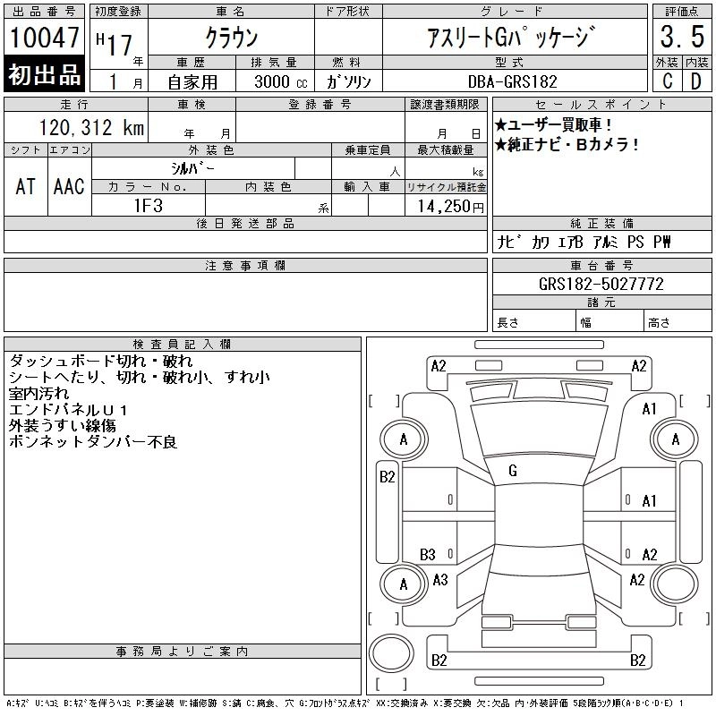 | ROYAL SALOON G | DBA-GRS182 | 3GR-FSE | FR | 6AT | 2994cc | 256ps(188kW)/6200rpm | AИ-95 | 5 019 000 | |
