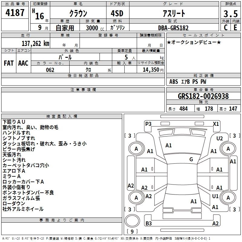| ATHLETE | CBA-GRS182 | 3GR-FSE | FR | 6AT | 2994cc | 256ps(188kW)/6200rpm | AИ-95 | 4 410 000 | |