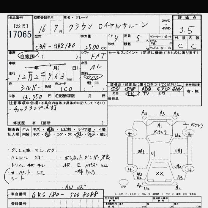| ROYAL SALOON | DBA-GRS182 | 3GR-FSE | FR | 6AT | 2994cc | 256ps(188kW)/6200rpm | AИ-95 | 4 263 000 | |