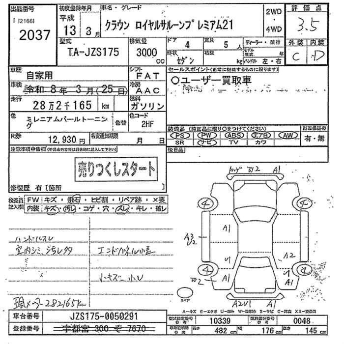 | ROYAL SALOON FOUR PREMIUM 21 | TA-JZS179 | 2JZ-GE | Full-time 4WD | 4AT | 2997cc | 220ps(162kW)/5800rpm | AИ-95 | 4 350 000 | |
