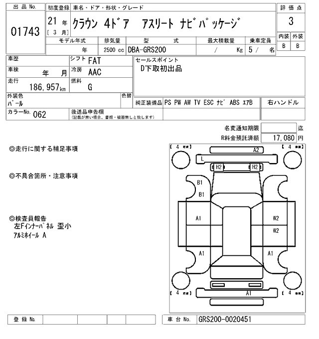 | 3.0 ROYAL SALOON ANNIVERSARY EDITION | DBA-GRS202 | 3GR-FSE | FR | 6AT | 2994cc | 256ps(188kW)/6200rpm | AИ-95 | 4 630 000 | |