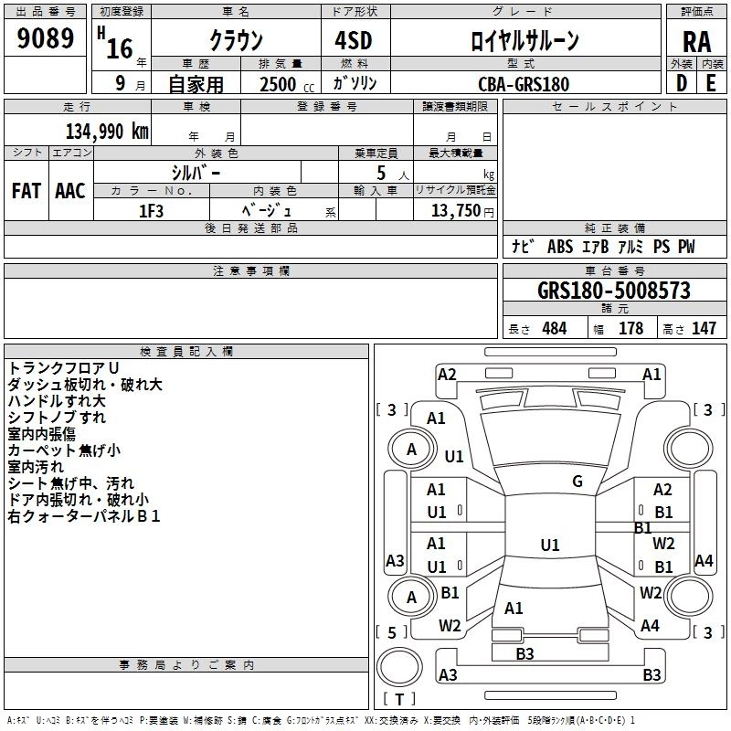 ROYAL SALOON CBA-GRS180 4GR-FSE FR 5AT 2499cc 215ps(158kW)/6400rpm AИ-95 3 400 000