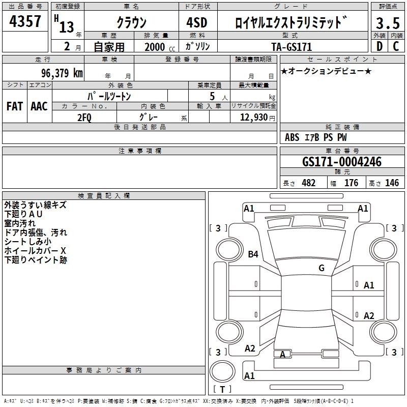 | ROYAL EXTRA FOUR | TA-JZS173 | 1JZ-GE | Full-time 4WD | 4AT | 2491cc | 196ps(144kW)/6000rpm | AИ-95 | 3 460 000 | |