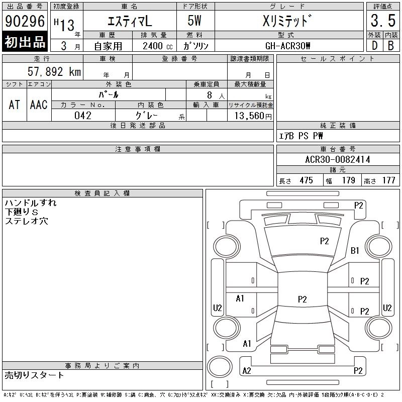 | AERAS | TA-ACR30W | 2AZ-FE | FF | 4AT | 2362cc | 160ps(118kW)/5600rpm | AИ-92 | 2 695 000 | |