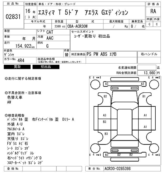 | AERAS | CBA-ACR30W | 2AZ-FE | FF | 4AT | 2362cc | 160ps(118kW)/5700rpm | AИ-92 | 2 829 750 | |