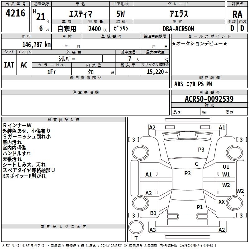 | AERAS | DBA-ACR50W | 2AZ-FE | FF | CVT | 2362cc | 170ps(125kW)/6000rpm | AИ-92 | 2 920 000 | |