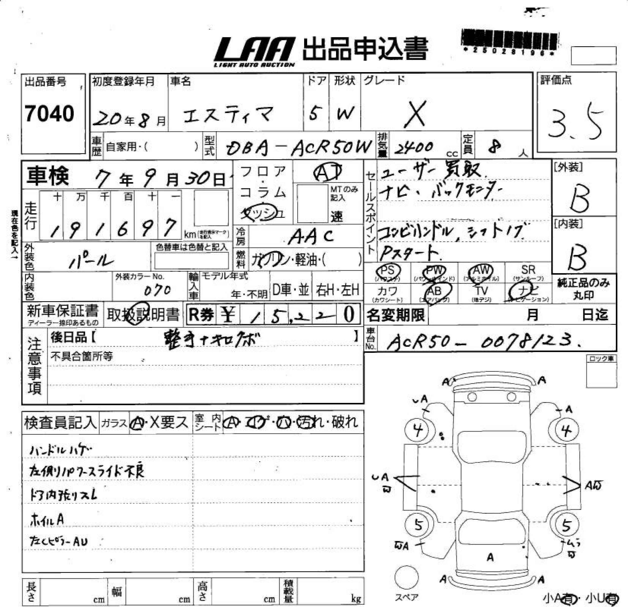 | AERAS | DBA-ACR50W | 2AZ-FE | FF | CVT | 2362cc | 170ps(125kW)/6000rpm | AИ-92 | 2 920 000 | |