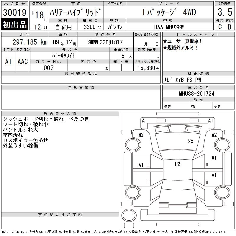 | L PACKAGE | DAA-MHU38W | 3MZ-FE | Full-time 4WD | CVT | 3310cc | 211ps(155kW)/5600rpm | AИ-95 | 4 410 000 | |