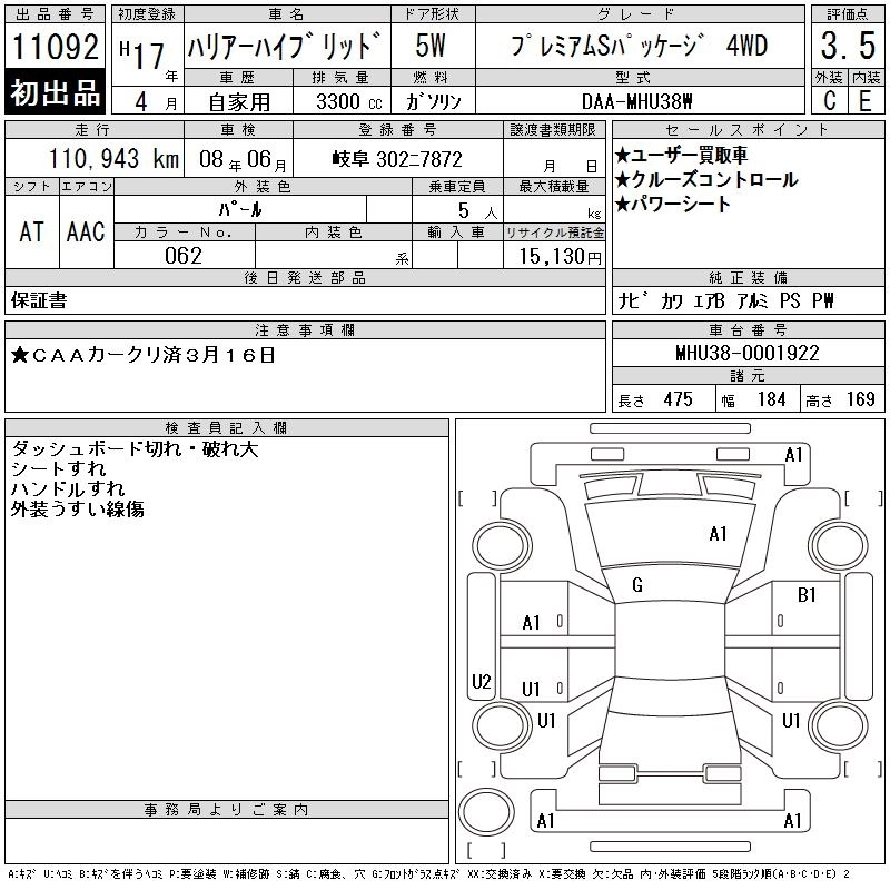 | PREMIUM S PACKAGE | DAA-MHU38W | 3MZ-FE | Full-time 4WD | CVT | 3310cc | 211ps(155kW)/5600rpm | AИ-95 | 4 620 000 | |