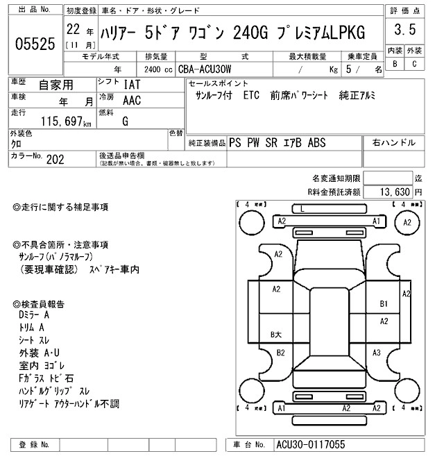 | 240G PREMIUM L PACKAGE | CBA-ACU35W | 2AZ-FE | Full-time 4WD | 4AT | 2362cc | 160ps(118kW)/5600rpm | AИ-92 | 3 255 000 | |