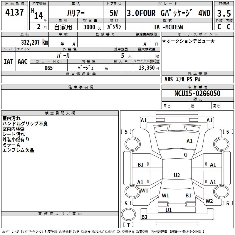 | 3.0 FOUR PRIME NAVI SELECTION | TA-MCU15W | 1MZ-FE | Full-time 4WD | 4AT | 2994cc | 220ps(162kW)/5800rpm | AИ-95 | 3 355 000 | |