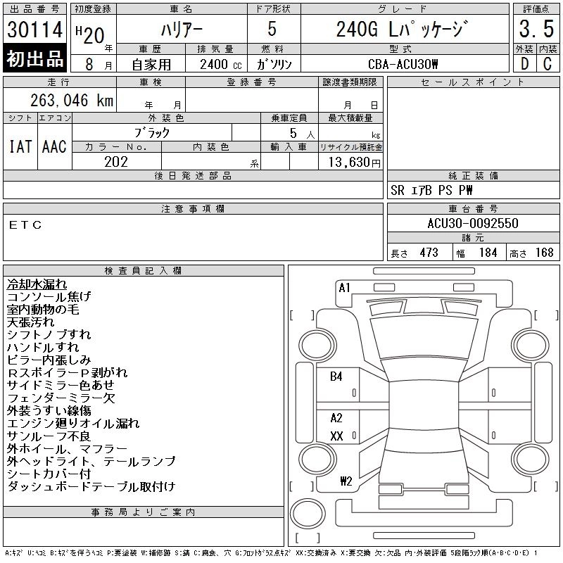 | 240G L PACKAGE ALCANTARA PRIME VERSION | CBA-ACU35W | 2AZ-FE | Full-time 4WD | 4AT | 2362cc | 160ps(118kW)/5600rpm | AИ-92 | 3 570 000 | |