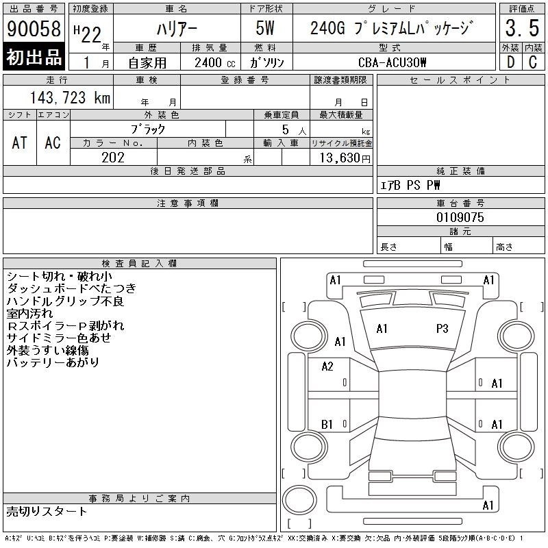 | 240G PREMIUM L PACKAGE | CBA-ACU30W | 2AZ-FE | FF | 4AT | 2362cc | 160ps(118kW)/5600rpm | AИ-92 | 3 003 000 | |